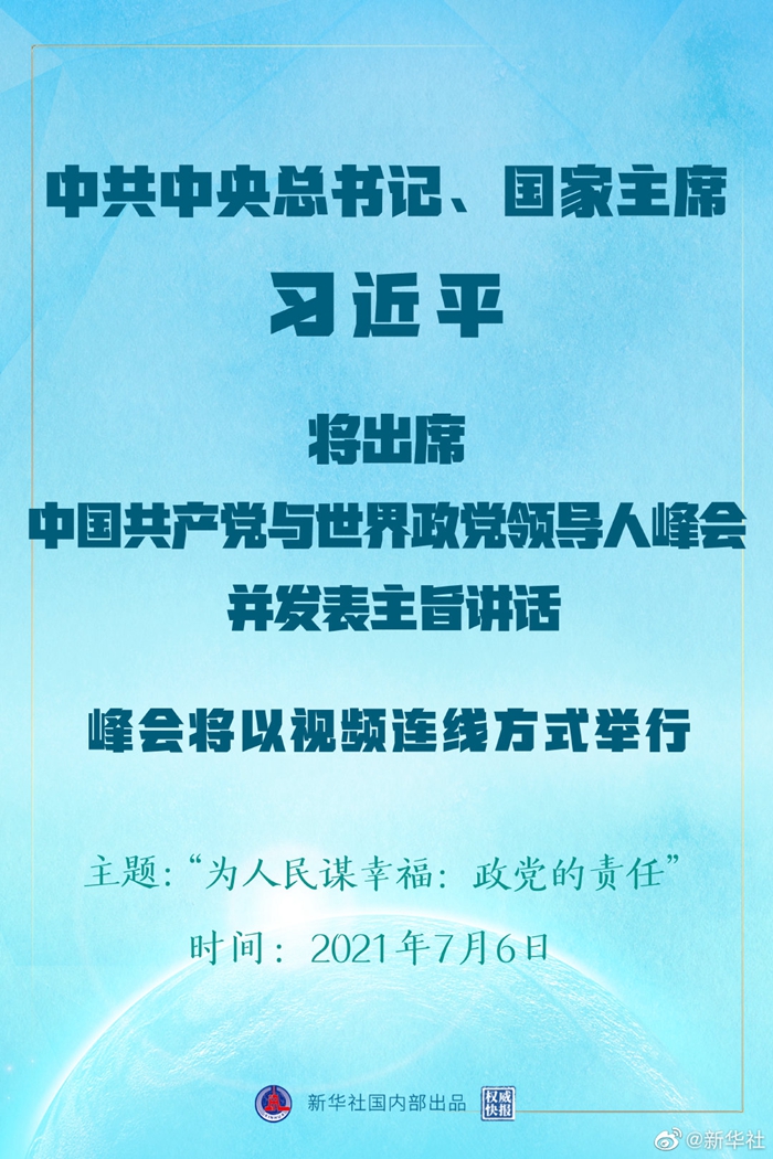 中共中央對(duì)外聯(lián)絡(luò)部發(fā)言人胡兆明5日宣布,中國共產(chǎn)黨與世界政黨領(lǐng)導(dǎo)人峰會(huì)將于7月6日以視頻連線方式舉行,中共中央總書記、國家主席習(xí)近平將在北京出席會(huì)議并發(fā)表主旨講話。此次會(huì)議的主題為“為人民謀幸福:政黨的責(zé)任”,160多個(gè)國家的500多位政黨和政治組織等領(lǐng)導(dǎo)人以及逾萬名政黨代表等將出席會(huì)議。