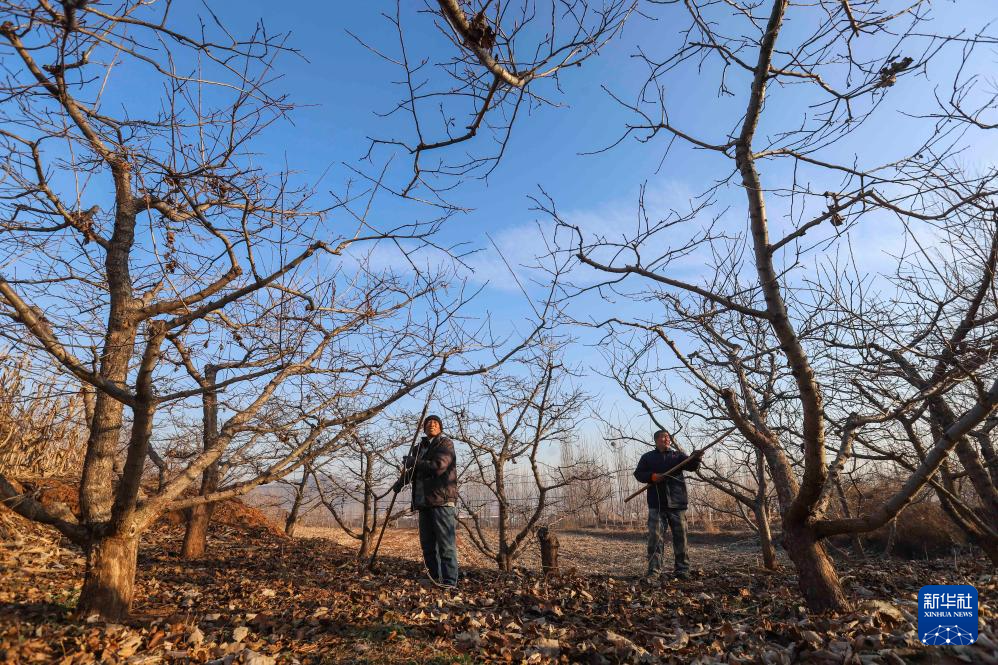 12月6日,河北省遵化市刘备寨乡农民为果树剪枝。