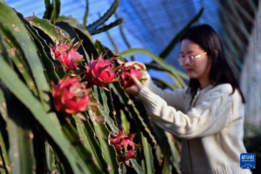 12月6日,在山东省烟台市福山区门楼街道,果农采摘火龙果。