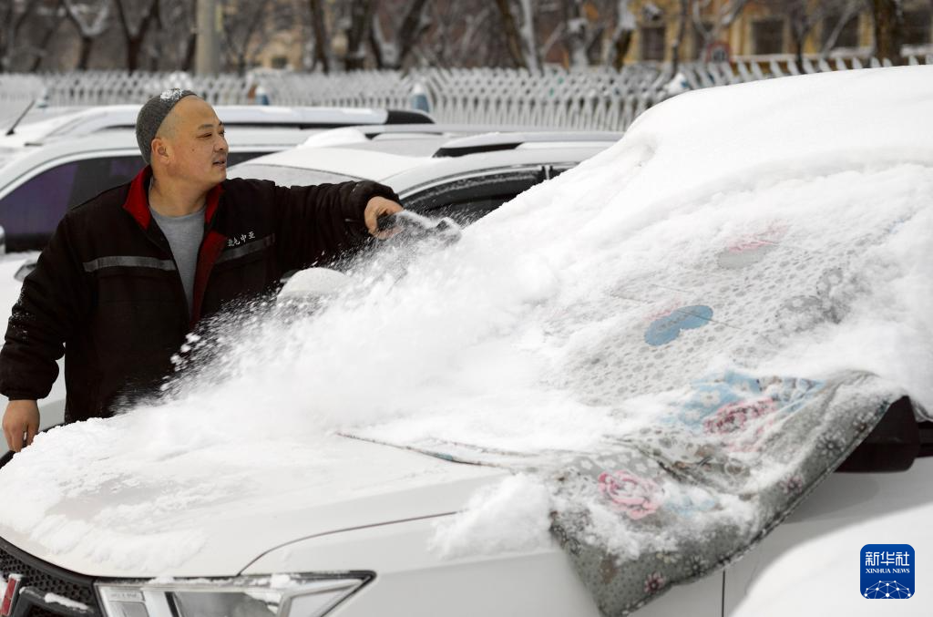 1月13日,新疆阿勒泰市民清理车辆上的积雪。新华社发(叶尔江·木哈买提 摄)