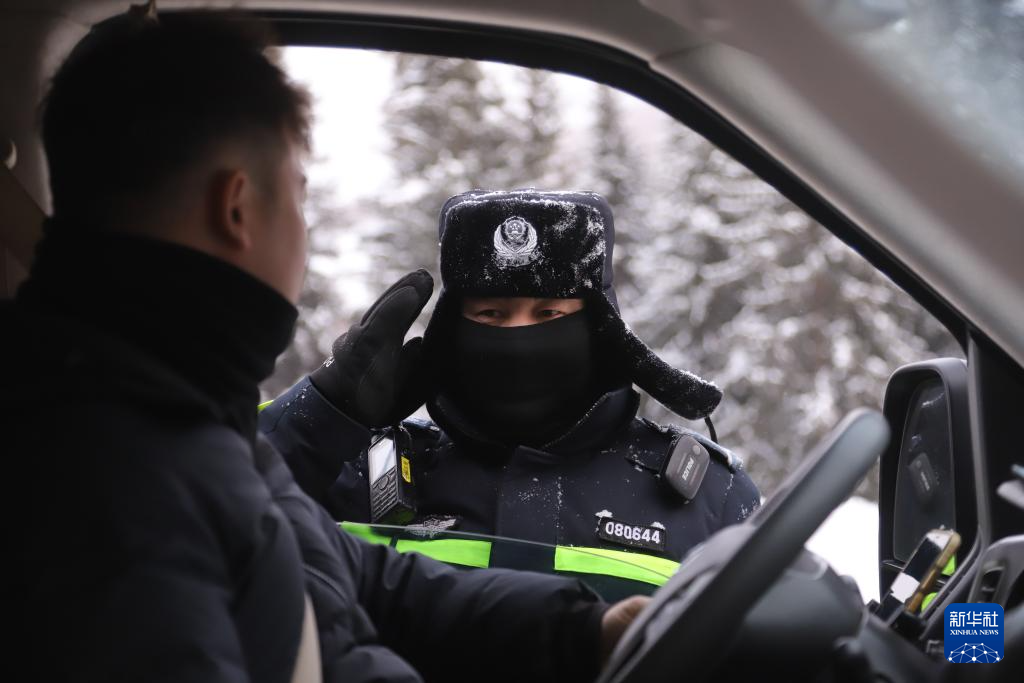 1月13日,在新疆喀纳斯景区贾登峪服务区大森林路口,民警驾驶警车引导往来车辆安全行驶。新华社发(叶德力·热哈提 摄)