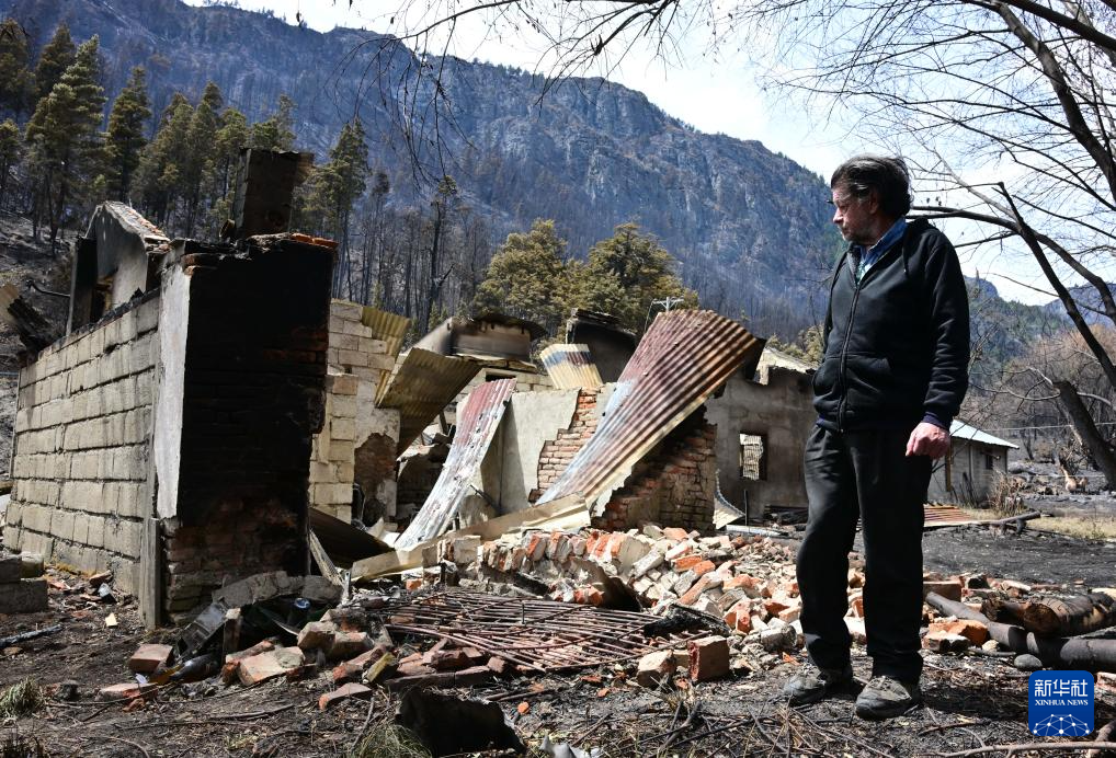 一名当地居民在阿根廷南部丘布特省埃普延市查看自己被烧毁的房屋(1月12日摄)。新华社发(马克西·约纳斯摄)