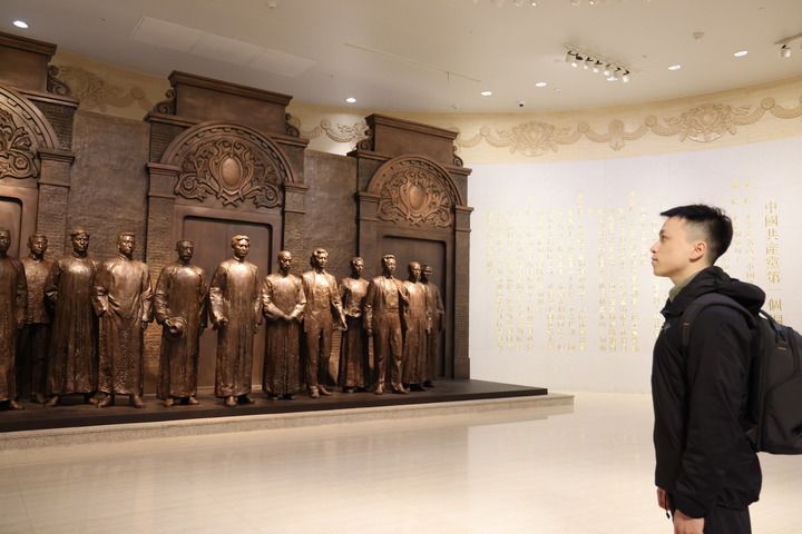 接过志愿者为进馆观众递上的新春“福”字,阮伟豪来到纪念馆序厅,在13名中共一大代表的群体铜像前停下脚步,“代表们平均年龄28岁,比我只大1岁,就开创了开天辟地的事业”。阮伟豪思忖之时,一旁的讲解员正向观众讲解:“一大代表中,最年轻的刘仁静只有19岁……这是一个年轻人组建的政党,乐观积极、锐意进取,这是早期中国共产党具有的重要优势,更是百年来中国共产党的一个重要特质……”