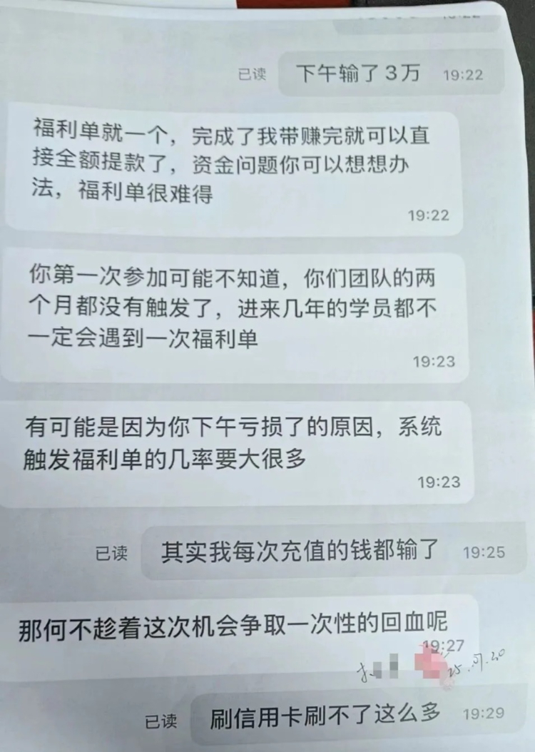第三步:用“小额甜头+福利单”,逼你加码。为进一步诱骗你投入更多,骗子会先让你尝到小甜头,比如徐女士起初收到的小额入账。等你开始依赖“导师”,再用“亏损后触发福利单”等说辞,让你投入更多,套得更深。