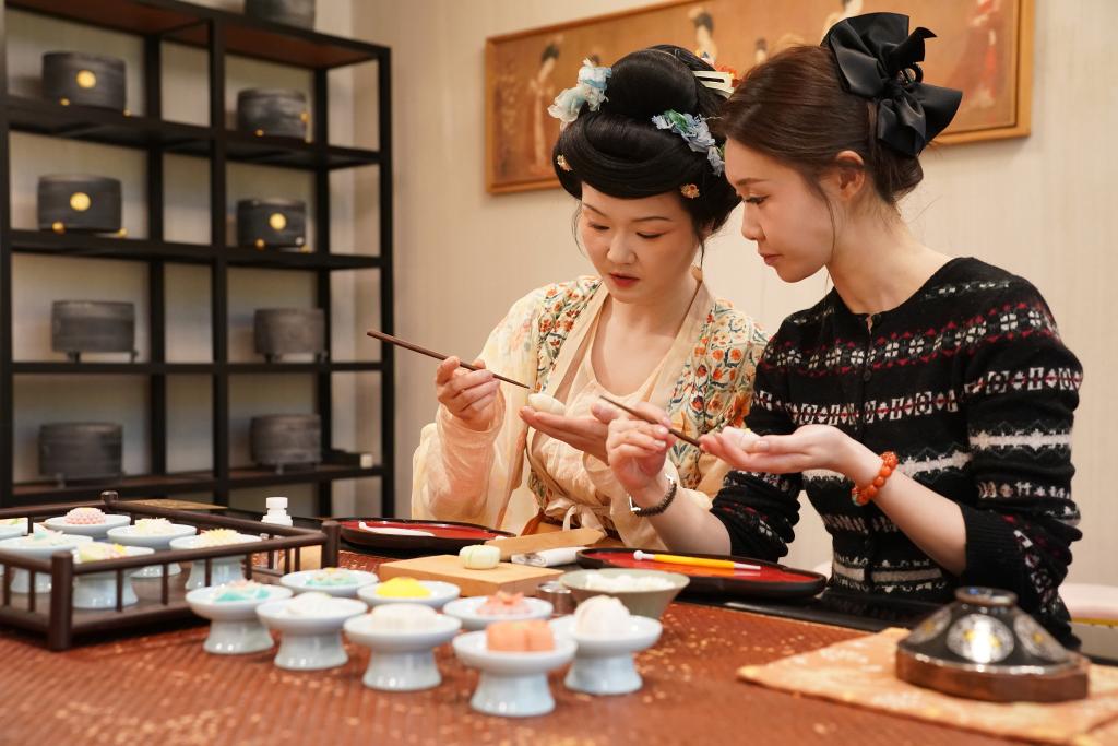 李欢认为,传统文化是取之不尽的创意源泉,而依托传统文化创新打造的消费形式和场景,更能让人们具象化地感受中华历史文化的魅力。因此,李欢和她的团队近年来不断拓宽品牌的经营方式,致力于搭建场景,让唐果子、唐茶文化走进国内外文化交流活动现场;依托各类艺术和商业场所,推出唐果子制作体验项目,吸引游客和研学团队参与。她们还整合唐茶等唐代生活的相关文化资源,向客户提供国风活动策划与演绎、教学培训、下午茶点、旅游伴手礼等服务和产品,让千年前的风雅韵味,化作更多人可感、可触、可尝的文化信物。