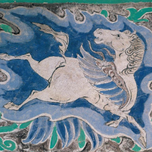 古人对马充满了浪漫想象。在有莫高窟“姊妹窟”之称的榆林窟,第10窟藻井外围的装饰花边绘有一匹通体白色、回首奔驰的翼马。王嘉奇介绍,白马有着蓝色羽翼,两条前腿交叉腾踏,两条后腿凌空飞奔,臀部和大腿肌肉发达。翼马造型简练、体态优美,是同题材的佳作。