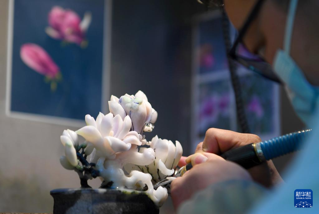 3月12日,河南省南阳市镇平县玉雕大师创意园一家工作室内,一名玉雕工作者在雕刻玉器。