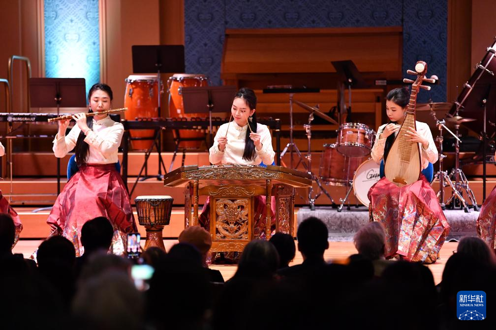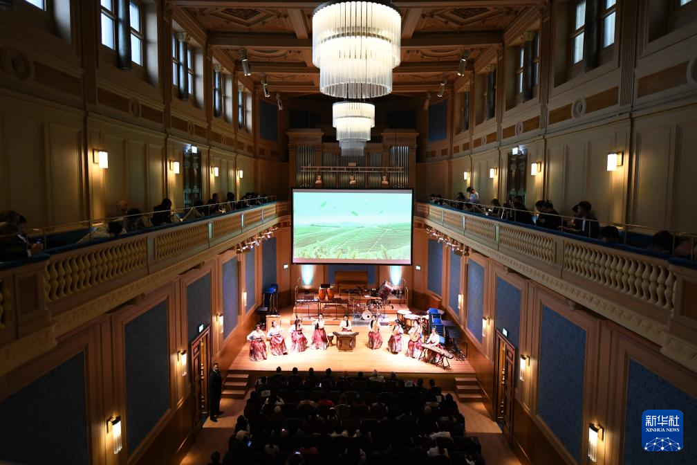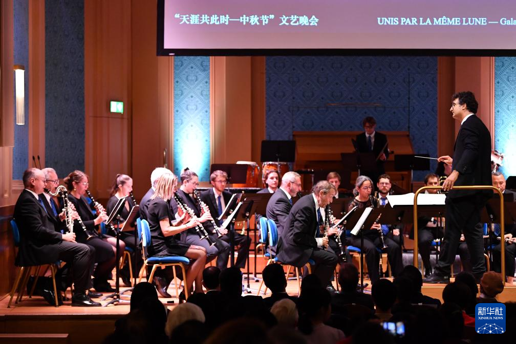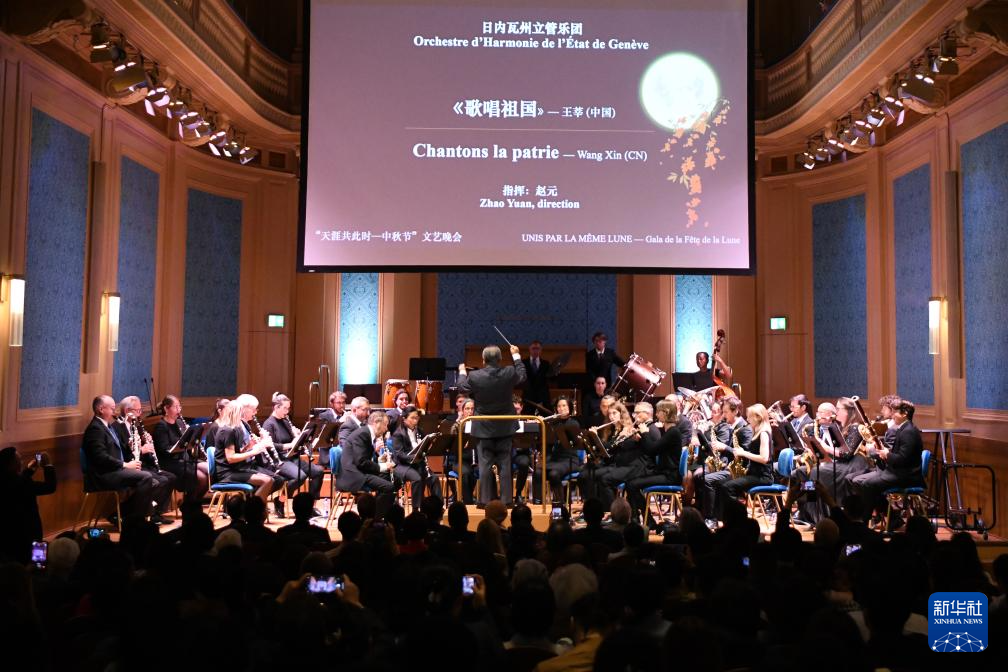 由瑞士伯尔尼中国文化中心主办的2025年“天涯共此时——中秋节”文艺晚会23日晚在日内瓦举行。来自杭州歌剧舞剧院“西子国乐”民乐团和瑞士日内瓦州立管乐团的音乐家们为现场观众献上了一场中西合璧的精彩演出,共同庆祝中华人民共和国成立76周年和中秋佳节。