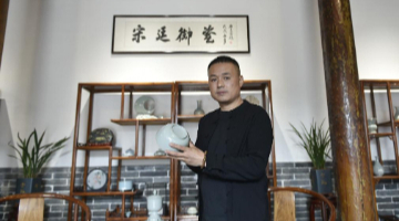 10月22日,河南省汝州市“宋京御窑厂”的汝瓷艺人赵永恒在展厅里展示汝瓷作品。