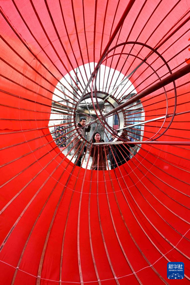 1月15日,工人在石家庄市藁城区屯头村一家宫灯厂制作大型宫灯。