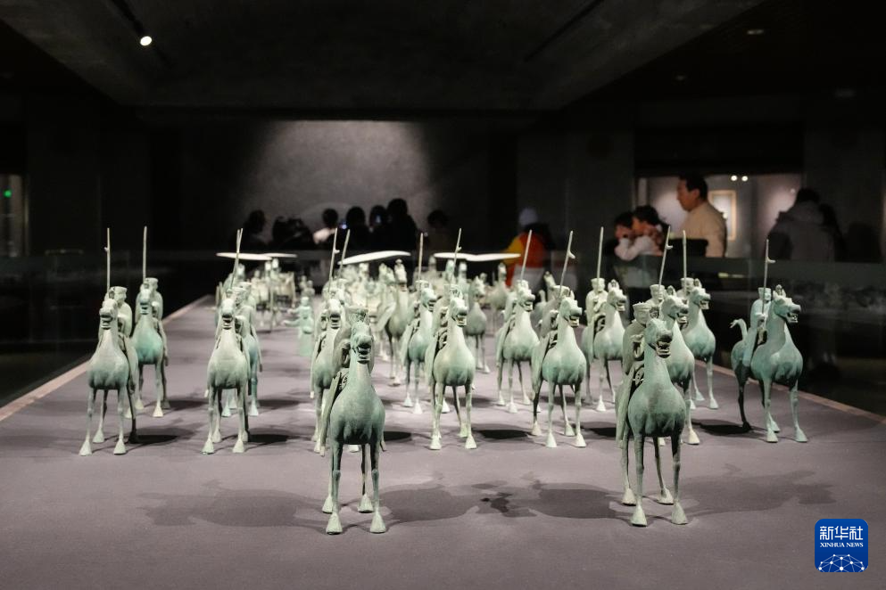 1月26日晚,在甘肃省博物馆二楼丝绸之路文明展厅,观众观看东汉铜车马仪仗队。