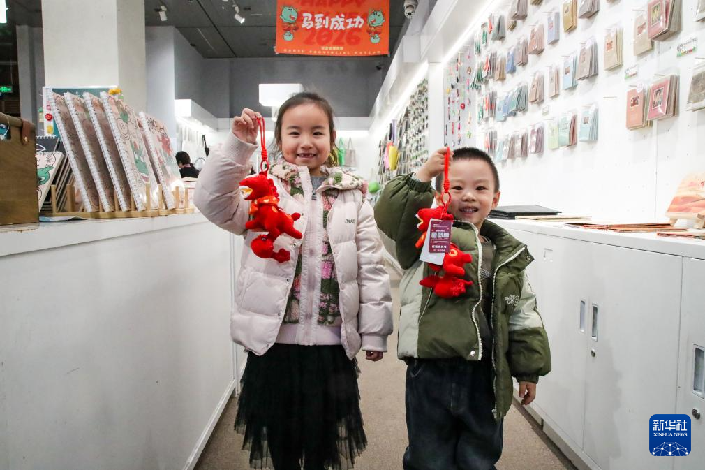 1月26日晚,在甘肃省博物馆文创商店,小朋友展示刚购买的新款马踏飞燕贺岁毛绒玩偶“红运当头马”。