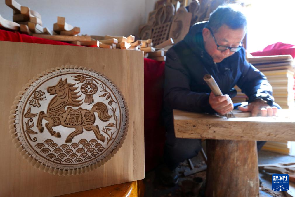 1月15日,在山东省临沂市蒙阴县桃墟镇,市级非物质文化遗产代表性传承人石绍松在雕琢马年主题文创作品。