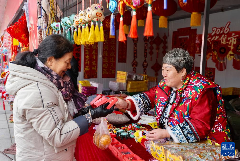 2月3日,游客在宁夏固原市西吉县年货大集上选购非遗文创产品。