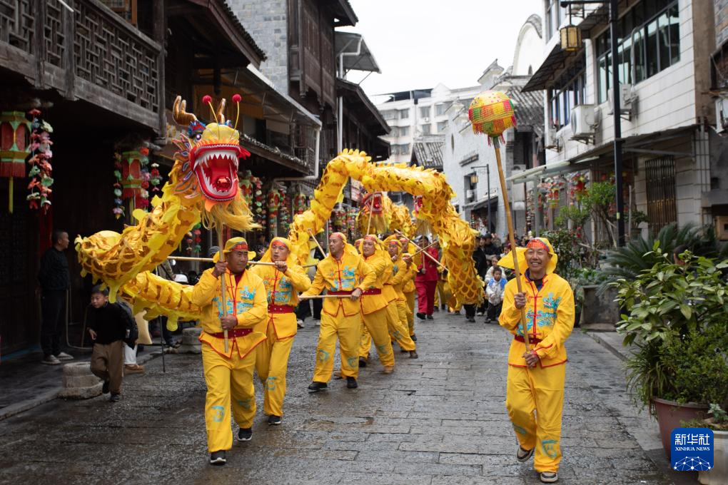 2月27日,村民在湖北省宣恩县高罗镇歌乐城社区进行舞龙表演。