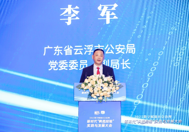 在实践分享环节,广东省云浮市公安局党委委员、副局长李军以《数字赋能驱动警务变革 法治公安筑牢平安基石》为题进行分享。