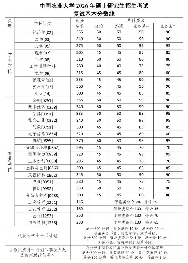 1.上表为我校复试基本分数要求,生源充裕学院可根据整体考试情况、招生计划、学科专业特点等,上调分数要求,但差额复试比例一般不得低于120%,报考该类学院的考生须达到学院公布的复试分数要求才能参加复试。