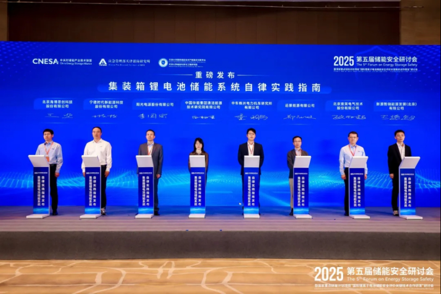 16日,在第五届储能安全研讨会暨国家重点研发计划项目“国际锂离子电池储能安全评价关键技术合作研发”研讨会现场,《集装箱锂电池储能系统自律实践指南》(以下简称《自律实践指南》)重磅发布。该文件由中关村储能产业技术联盟牵头,联盟常务理事会成员等25家行业龙头企业共同发起制定,是行业首份针对集装箱锂电池储能系统的规范性指导文件,也是行业首次将共识转化为系统性实践规范。