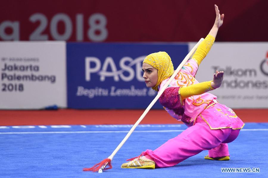 ?Zahra Kiani of Iran competes during the Qiangshu competition of Women's Jianshu & Qiangshu All-Round match at the 18th Asian Games in Jakarta, Indonesia, Aug. 21, 2018. (Xinhua/Cheong Kam Ka)