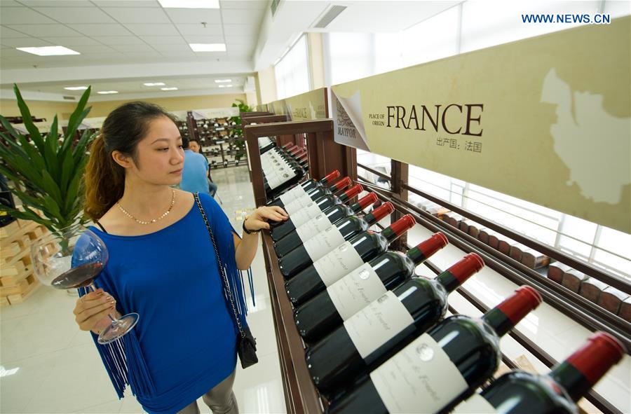 A woman looks at red wine imported from France at the first Chongqing international red wine cultural festival in Chongqing, southwest China, Sept. 2, 2012. (Xinhua/Liu Chan)