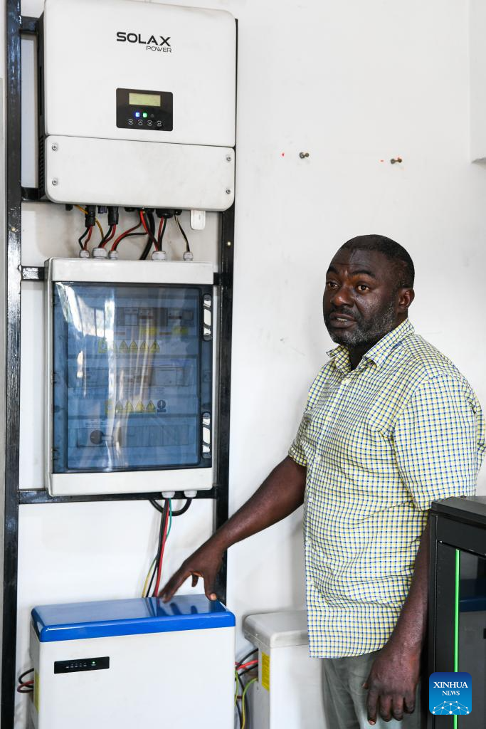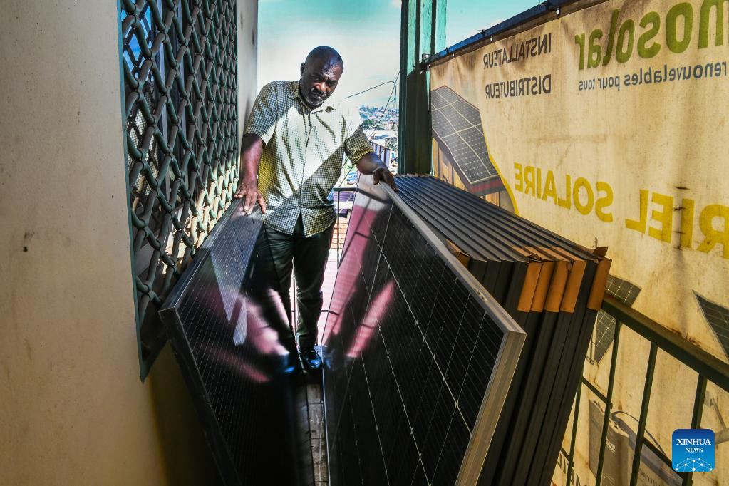 A businessman displays photovoltaic equipment outside his shop in Buea, Southwest Region, Cameroon, on June 17, 2025. (Photo by Muleng Timngum/Xinhua)
