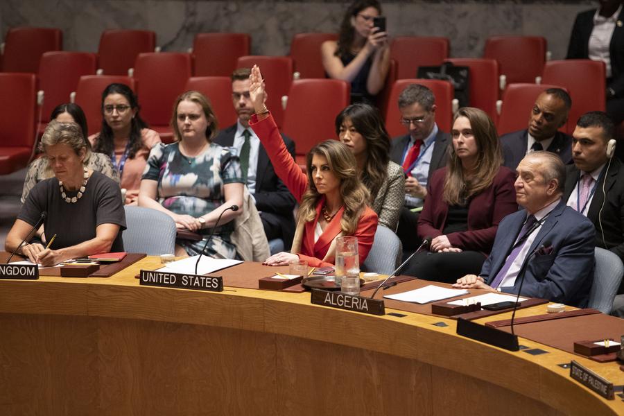 U.S. Deputy Special Presidential Envoy to the Middle East Morgan Ortagus (L, front) votes against a draft resolution during a UN Security Council meeting at the UN headquarters in New York, Sept. 18, 2025. The United States on Thursday vetoed a UN Security Council draft resolution that would have demanded Israel immediately lift all restrictions on humanitarian access and delivery in Gaza. (Xinhua/Xie E)