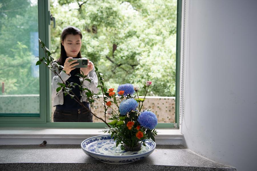 A student takes photos of a flower arrangement artwork created by Fu Yulan at the School of Forestry and Landscape Architecture of Anhui Agricultural University in Hefei, east China's Anhui Province, Sept. 30, 2025. (Xinhua/Zhang Duan)