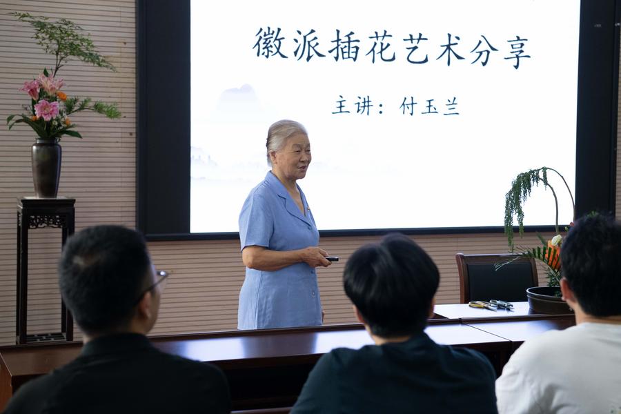 Fu Yulan (2nd L) introduces knowledge on the Hui-style flower arrangement art to young teachers at the School of Forestry and Landscape Architecture of Anhui Agricultural University in Hefei, east China's Anhui Province, Sept. 30, 2025. (Xinhua/Zhang Duan)