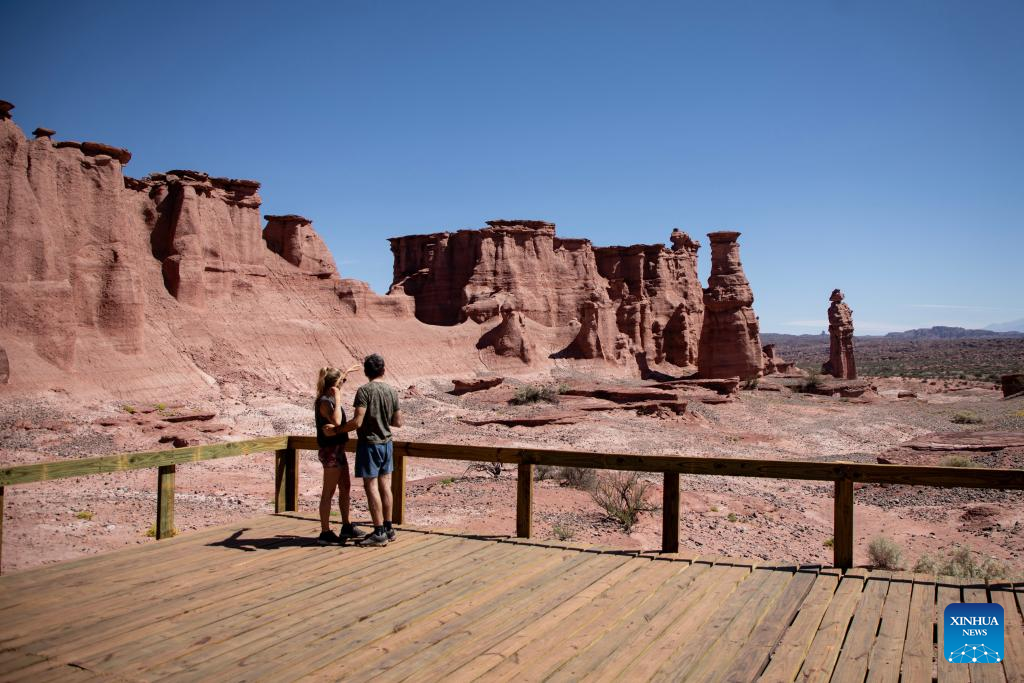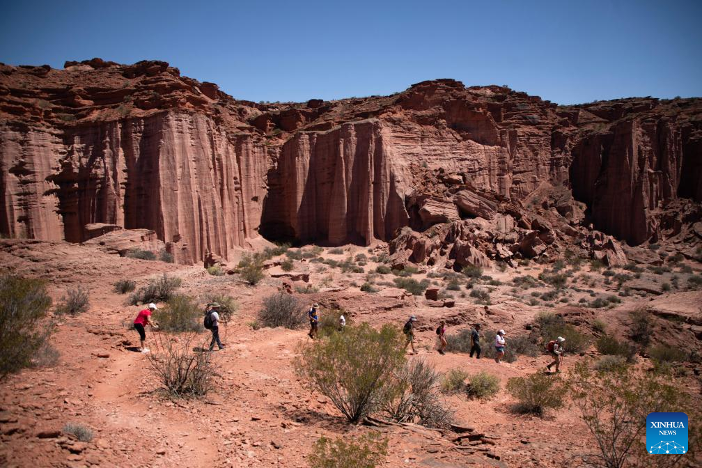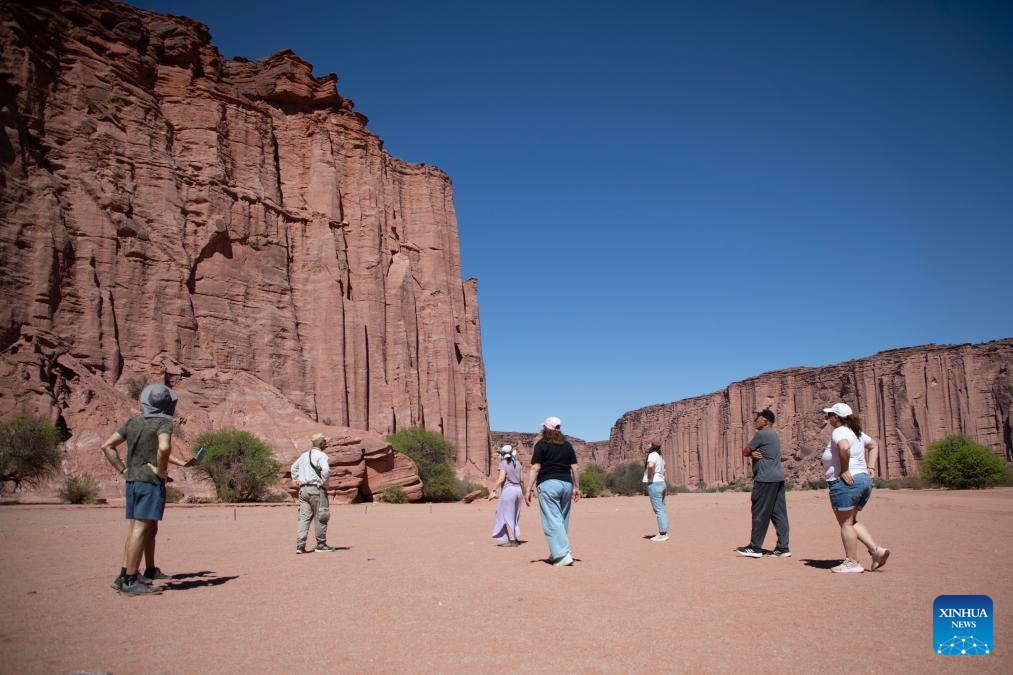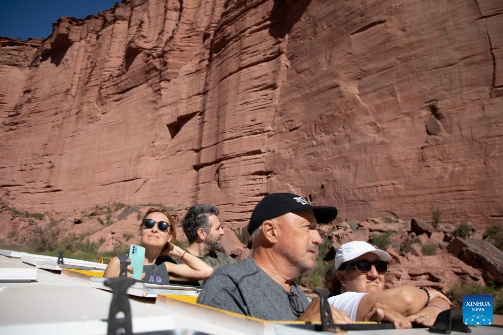 Visitors view the rock formations of the Talampaya Canyon at the Talampaya National Park in La Rioja Province, Argentina, on Oct. 11, 2025. The Talampaya National Park, covering an area of 215,000 hectares, is inscribed on the UNESCO World Heritage List. (Photo by Martin Zabala/Xinhua)