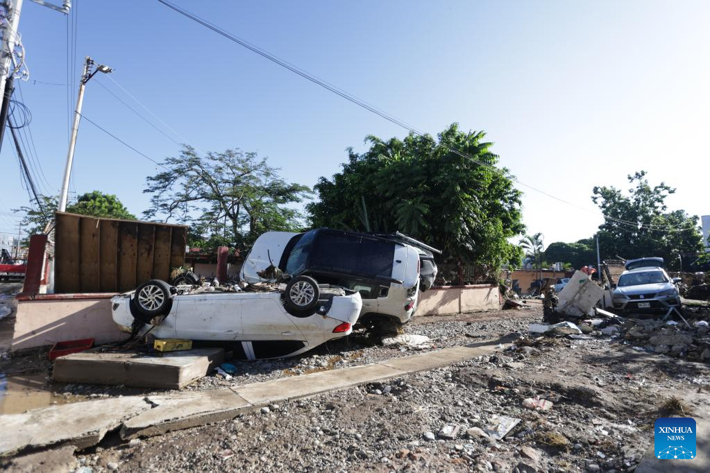 Vehicles damaged by flood are seen on the street in Poza Rica city, Veracruz state, Mexico, Oct. 12, 2025. (Photo by Francisco Canedo/Xinhua)
