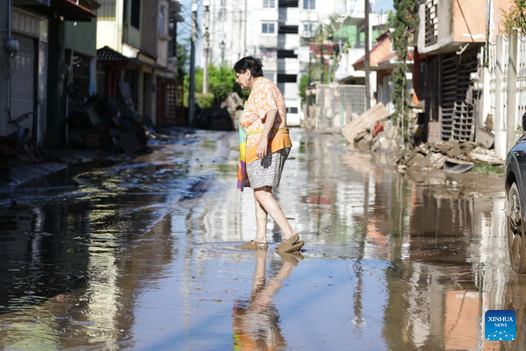 A woman walks along a street affected by the heavy rain in the city of Poza Rica, Veracruz state, Mexico, Oct. 12, 2025. (Photo by Francisco Canedo/Xinhua)