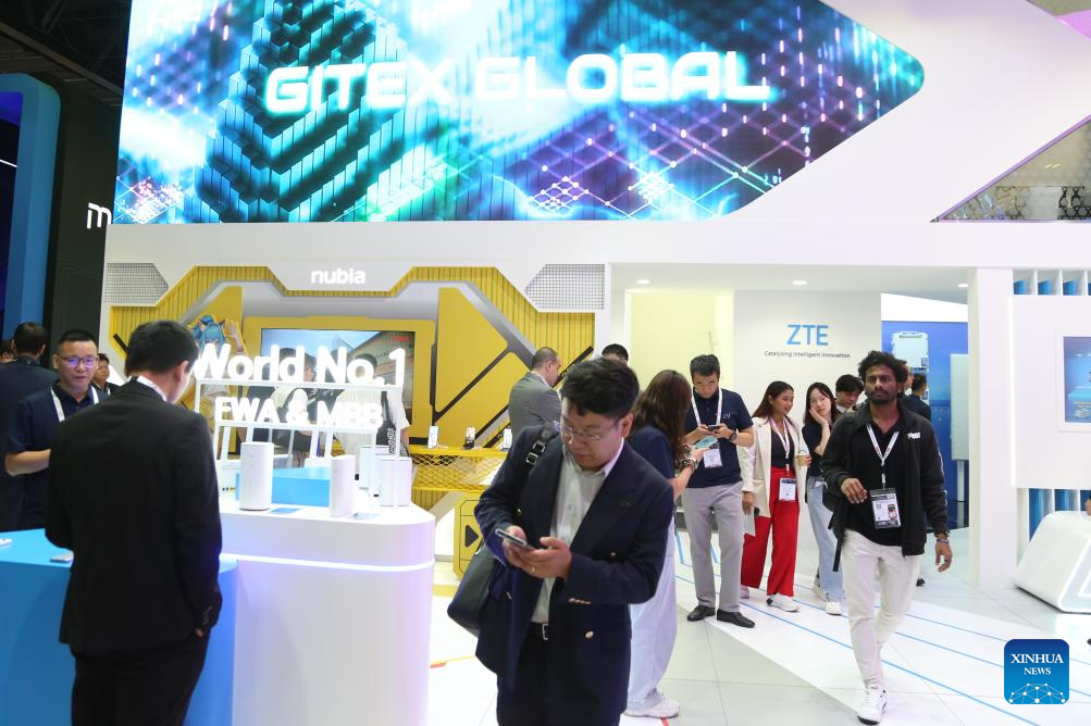 This photo taken on Oct. 13, 2025 shows a scene at the booth of Chinese tech company ZTE at the 45th edition of GITEX Global in Dubai, the United Arab Emirates. (Xinhua/Wen Xinnian)