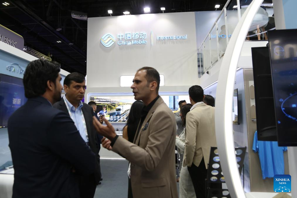 This photo taken on Oct. 13, 2025 shows a scene at the booth of Chinese telecommunications carrier China Mobile at the 45th edition of GITEX Global in Dubai, the United Arab Emirates. (Xinhua/Wen Xinnian)