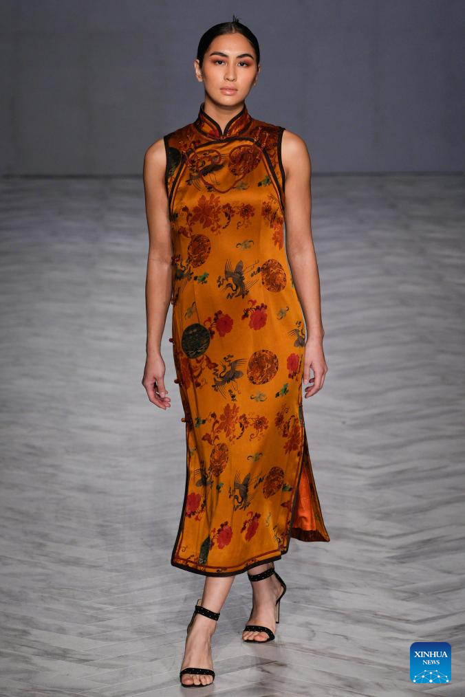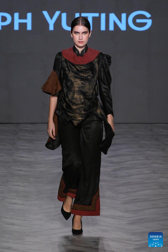 A model presents a creation from China's Jeph Yuting during the Spring/Summer 2026 collections fashion show at Vancouver Fashion Week in Vancouver, British Columbia, Canada, Oct. 18, 2025. (Photo by Liang Sen/ Xinhua)