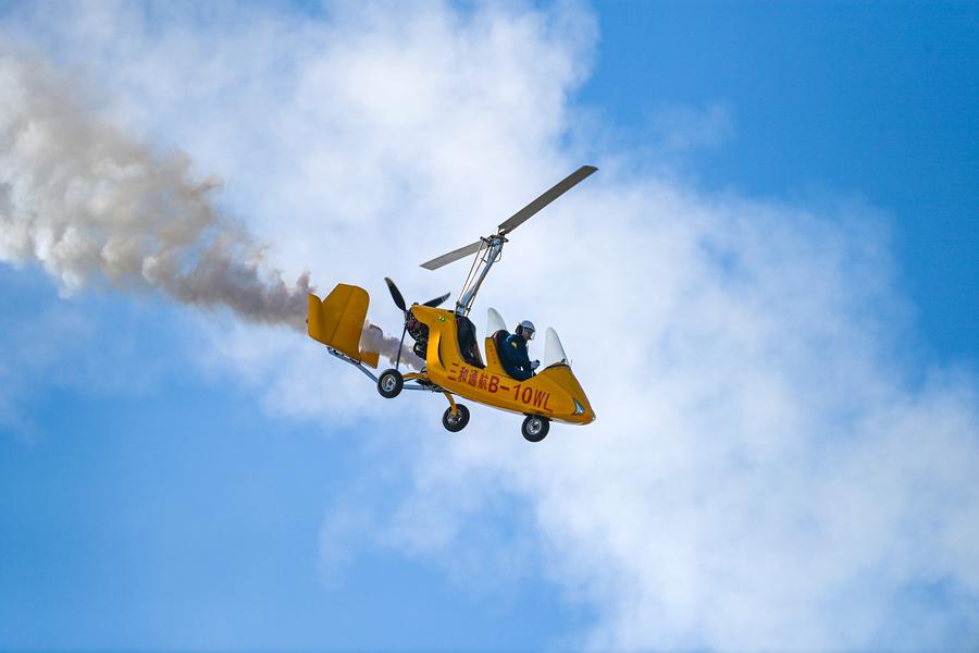 A gyrocopter performs during the 7th China Helicopter Exposition in north China's Tianjin, Oct. 18, 2025. (Xinhua/Zhao Zishuo)