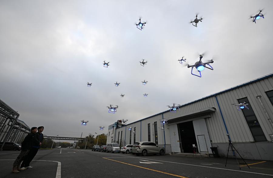 Staff members of EFY Intelligent Control (Tianjin) Technology Co., Ltd. test a fleet of drones in Binhai New Area of Tianjin, north China, Nov. 14, 2024. (Xinhua/Zhao Zishuo)