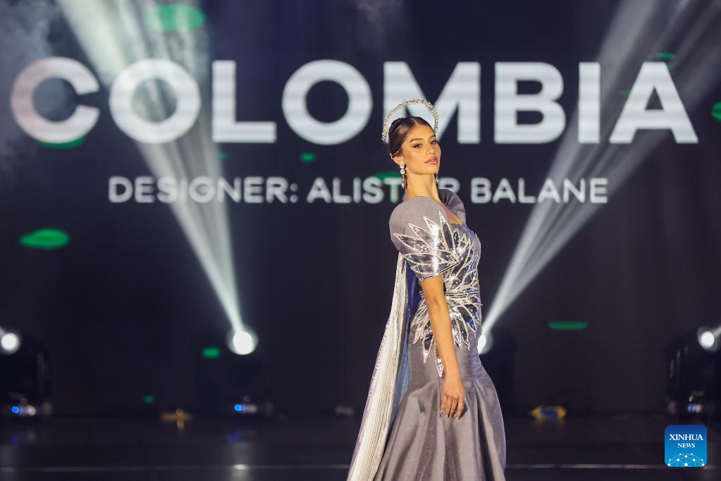 Valentina Collazos of Colombia presents a creation during the Miss Earth 2025 Philippine Terno Fashion Show in Quezon City, the Philippines on Oct. 22, 2025. Miss Earth 2025 candidates from various countries participated in the fashion show featuring gowns made by Filipino designers in celebration of the beauty pageant's 25th anniversary. The coronation night of Miss Earth 2025 will be held on Nov. 5. (Xinhua/Rouelle Umali)