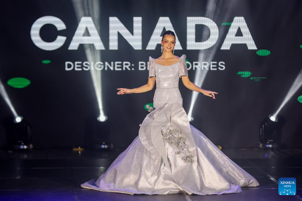 Hailey Wilson of Canada presents a creation during the Miss Earth 2025 Philippine Terno Fashion Show in Quezon City, the Philippines on Oct. 22, 2025. Miss Earth 2025 candidates from various countries participated in the fashion show featuring gowns made by Filipino designers in celebration of the beauty pageant's 25th anniversary. The coronation night of Miss Earth 2025 will be held on Nov. 5. (Xinhua/Rouelle Umali)