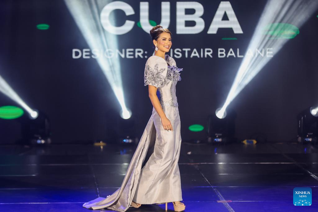 Rachel Chang of Cuba presents a creation during the Miss Earth 2025 Philippine Terno Fashion Show in Quezon City, the Philippines on Oct. 22, 2025. Miss Earth 2025 candidates from various countries participated in the fashion show featuring gowns made by Filipino designers in celebration of the beauty pageant's 25th anniversary. The coronation night of Miss Earth 2025 will be held on Nov. 5. (Xinhua/Rouelle Umali)