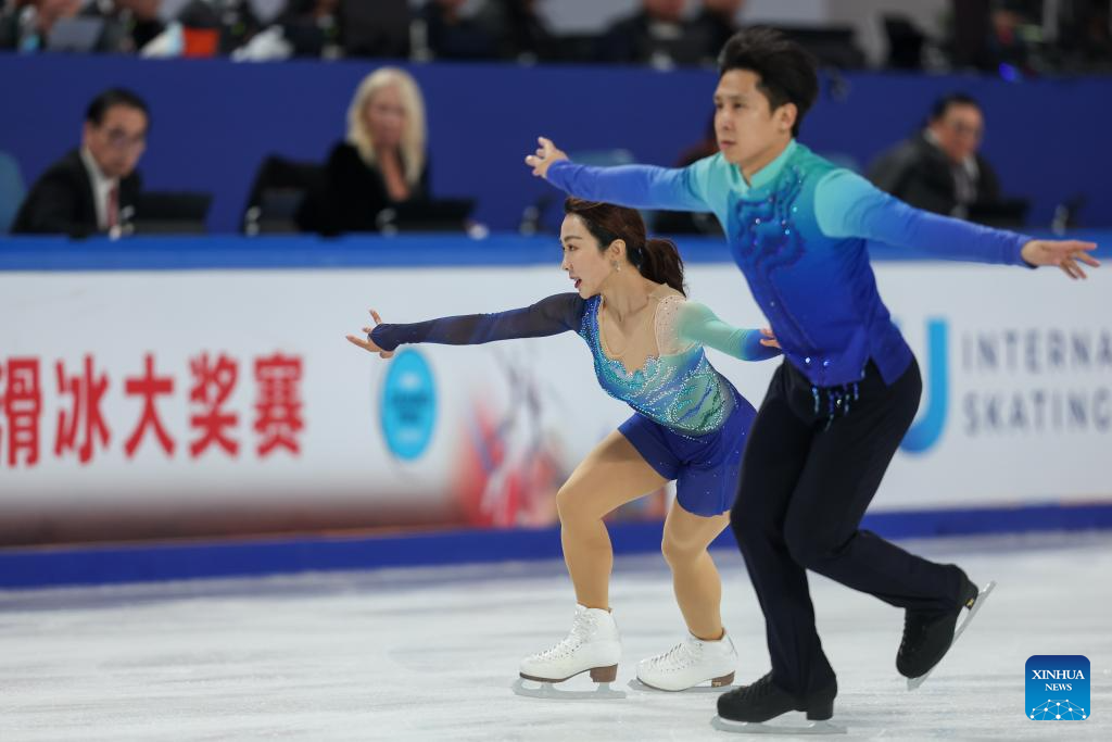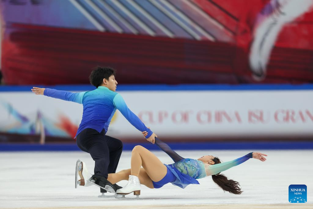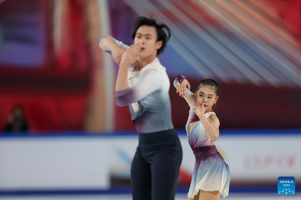 Zhang Jiaxuan (R)/Huang Yihang of China perform during the pair skating free skating at the Cup of China ISU Grand Prix of Figure Skating 2025 in southwest China's Chongqing Municipality, on Oct. 25, 2025. (Xinhua/Huang Wei)