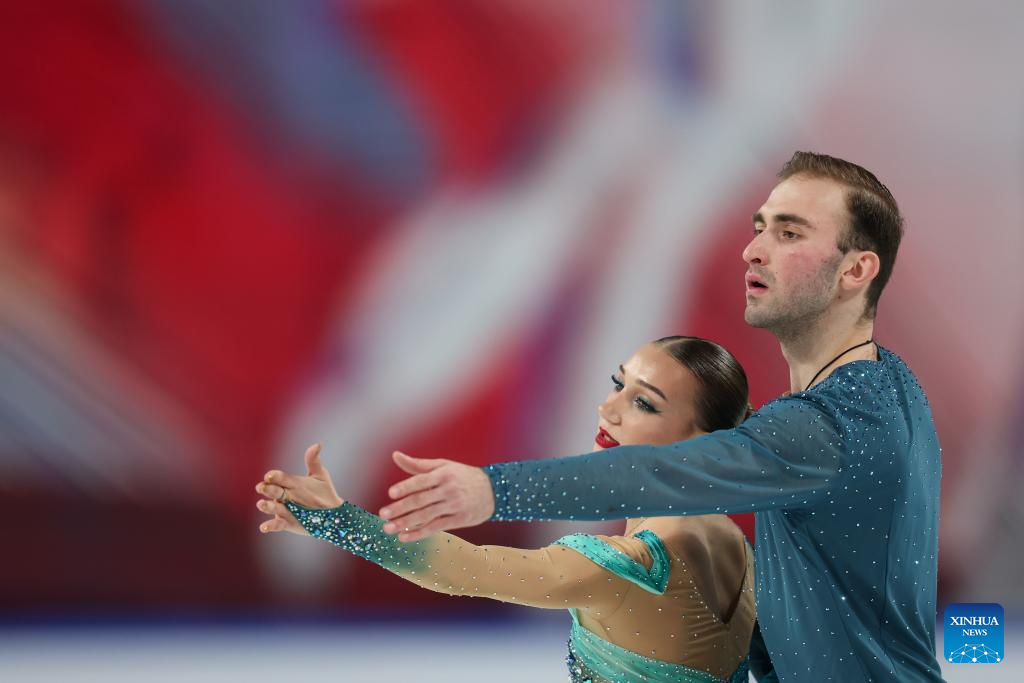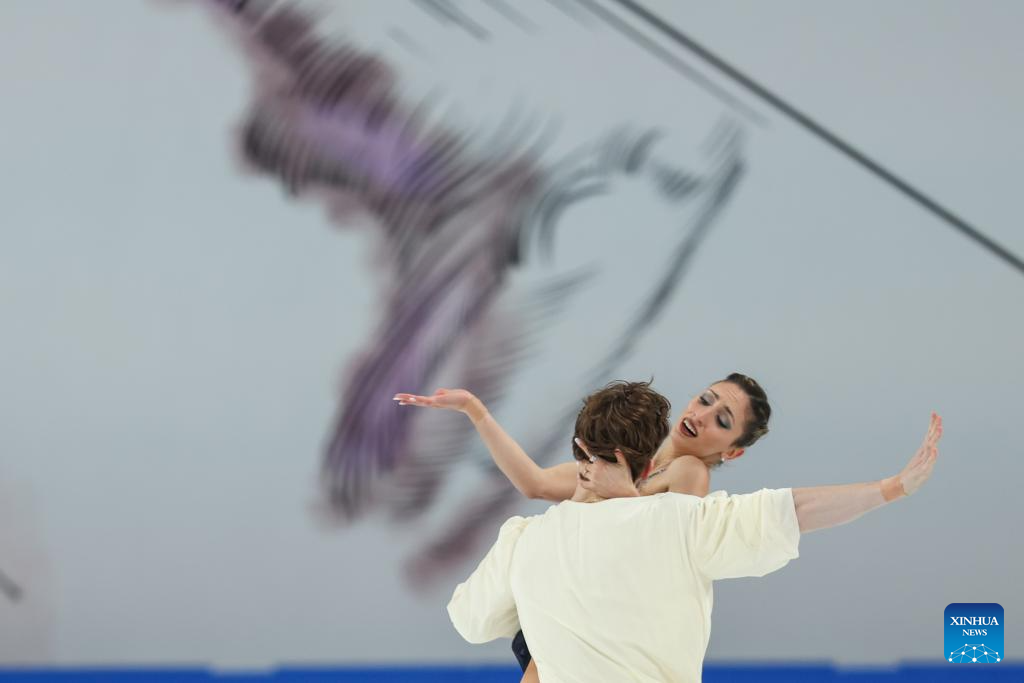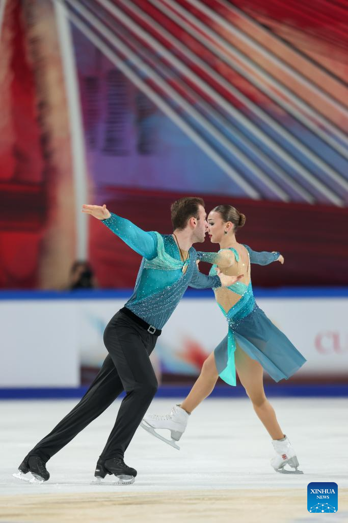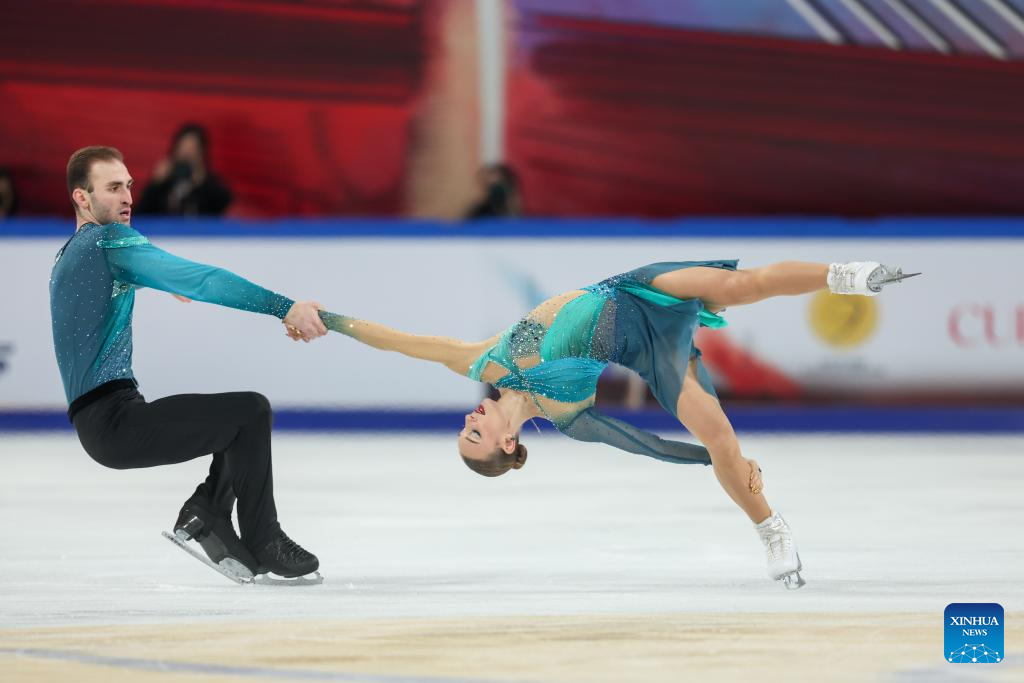 Anastasiia Metelkina (L)/Luka Berulava of Georgia perform during the pair skating free skating at the Cup of China ISU Grand Prix of Figure Skating 2025 in southwest China's Chongqing Municipality, on Oct. 25, 2025. (Xinhua/Huang Wei)