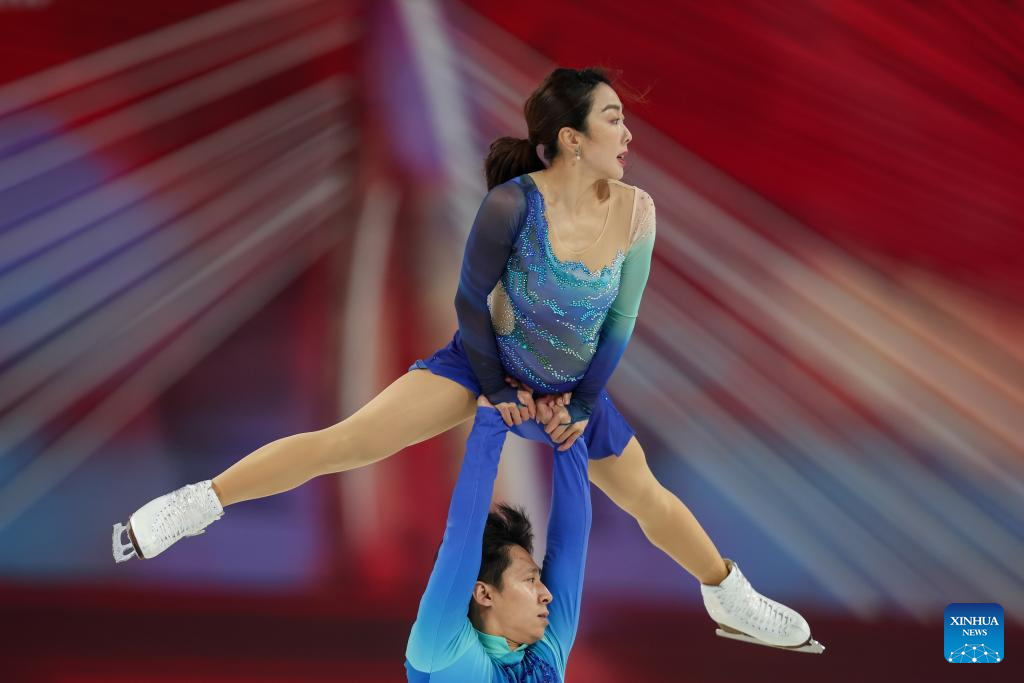 Sui Wenjing (top)/Han Cong of China perform during the pair skating free skating at the Cup of China ISU Grand Prix of Figure Skating 2025 in southwest China's Chongqing Municipality, on Oct. 25, 2025. (Xinhua/Huang Wei)