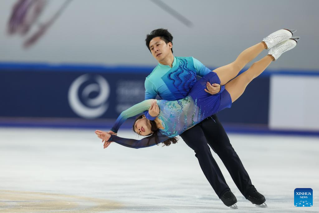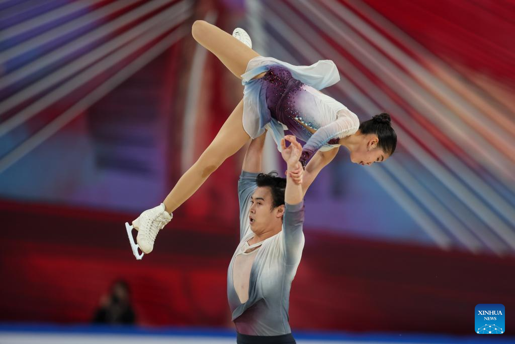 Zhang Jiaxuan (top)/Huang Yihang of China perform during the pair skating free skating at the Cup of China ISU Grand Prix of Figure Skating 2025 in southwest China's Chongqing Municipality, on Oct. 25, 2025. (Xinhua/Huang Wei)