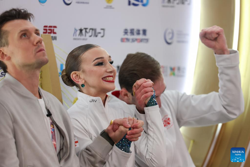 Anastasiia Metelkina (C)/Luka Berulava (R) of Georgia celebrate during the pair skating free skating at the Cup of China ISU Grand Prix of Figure Skating 2025 in southwest China's Chongqing Municipality, on Oct. 25, 2025. (Xinhua/Huang Wei)
