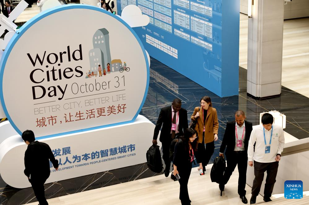 Guests walk into the venue of the 2025 SDG Cities Global Conference in east China's Shanghai, Oct. 26, 2025. Themed "Innovative Development Towards People-Centered Smart Cities" this year, the 2025 SDG Cities Global Conference kicked off here on Sunday. (Xinhua/Fang Zhe)