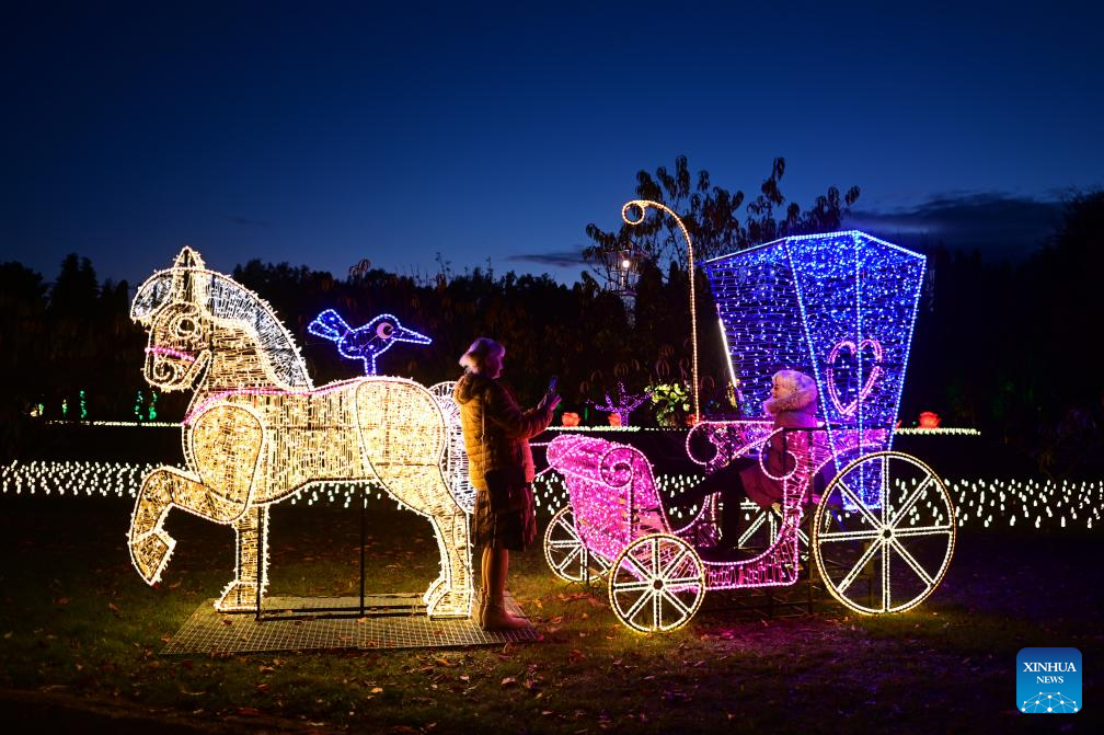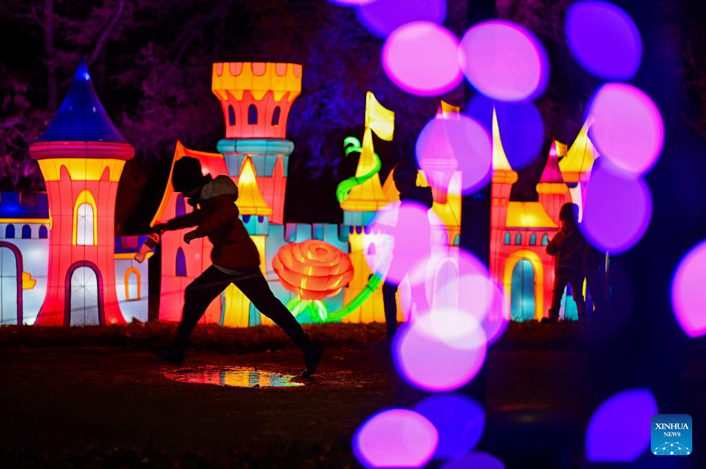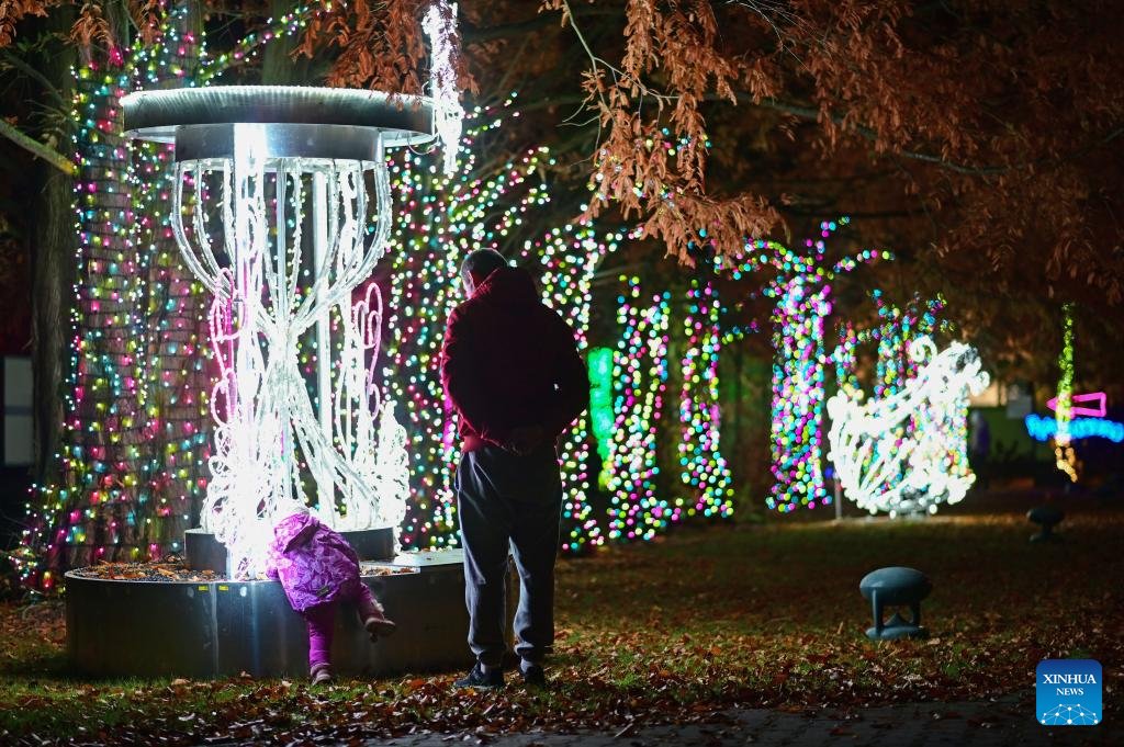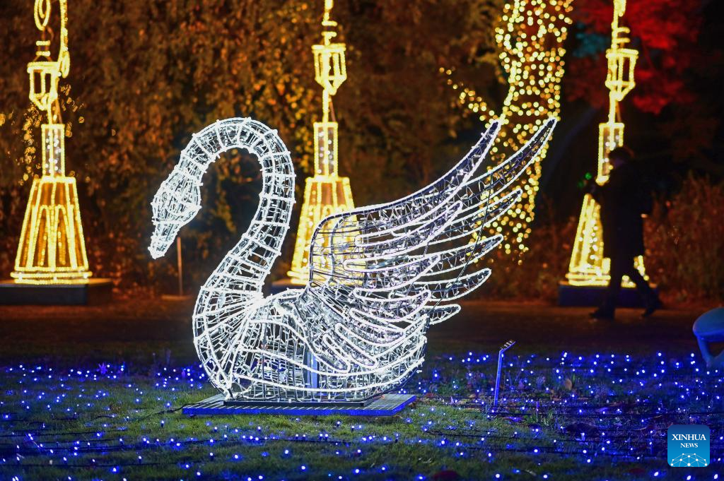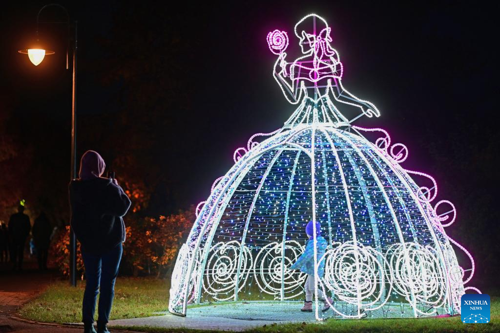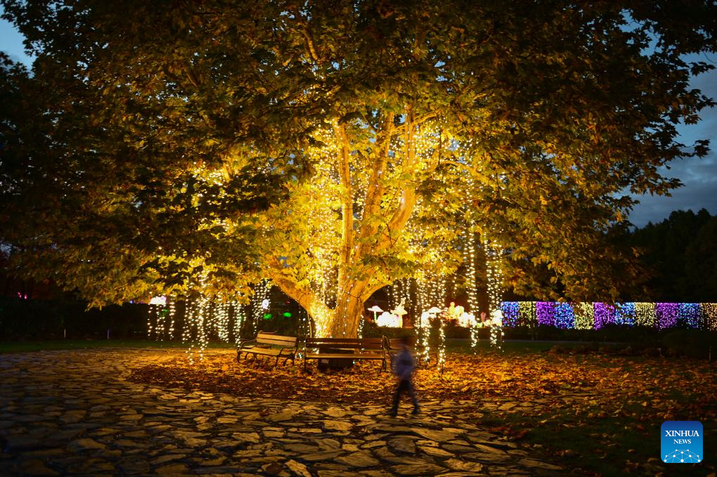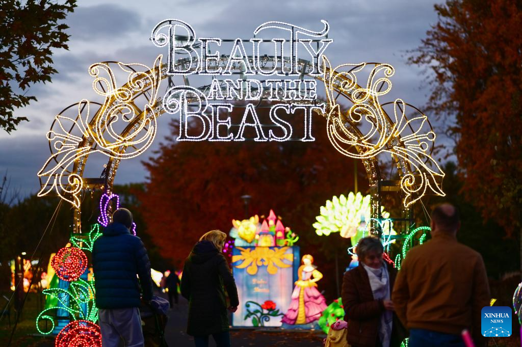 People visit the Garden of Lights show at the Botanical Garden of the Polish Academy of Sciences in suburban Warsaw, Poland, on Oct. 25, 2025. This year's exhibition, themed "Beauty and the Beast," has attracted many residents and tourists. (Photo by Aleksy Witwicki/Xinhua)