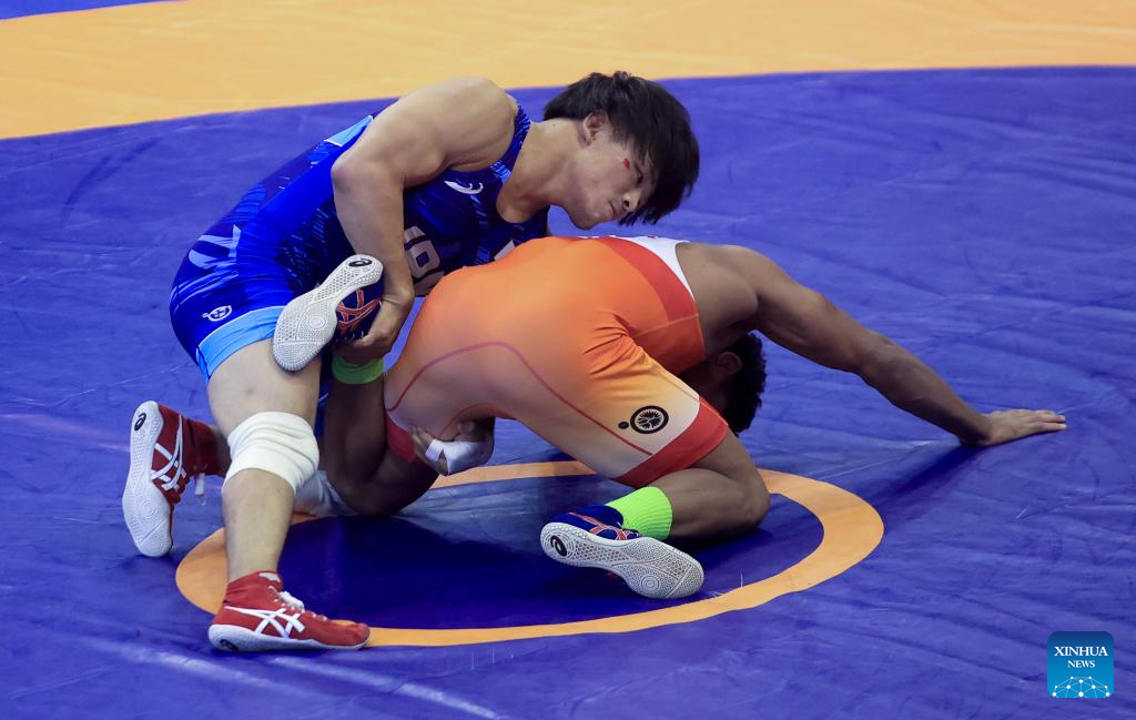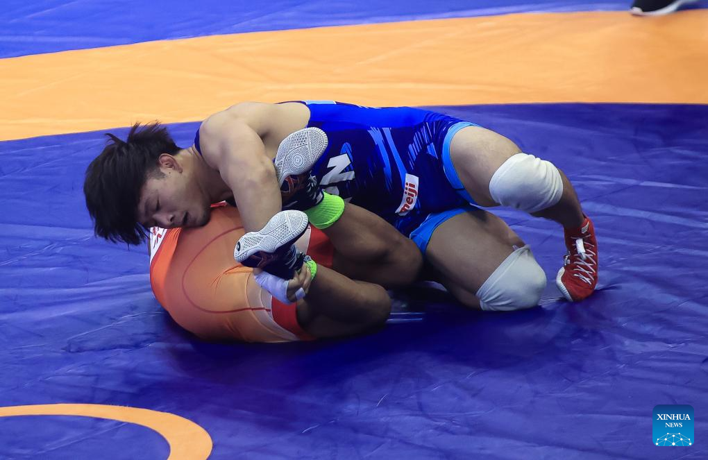 Japan's Aoyagi Yoshinosuke (top) and India's Parvinder Parvinder compete during their match for bronze medal of the men's freestyle 74 kg category at the U23 Wrestling World Championships in Novi Sad, Serbia on Oct. 25, 2025. (Photo by Predrag Milosavljevic/Xinhua)