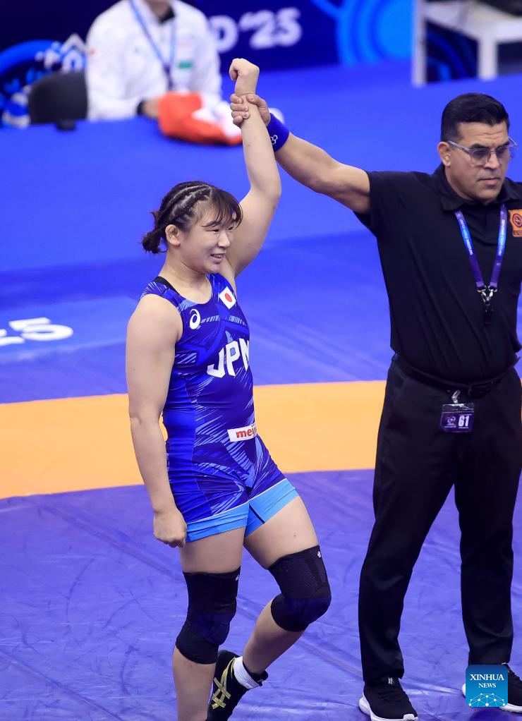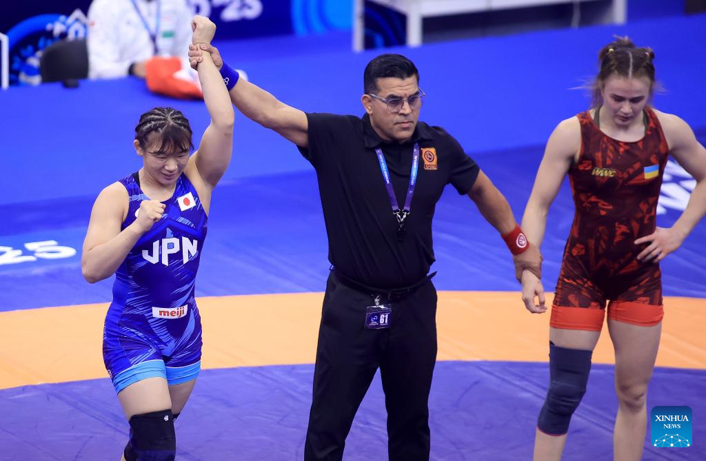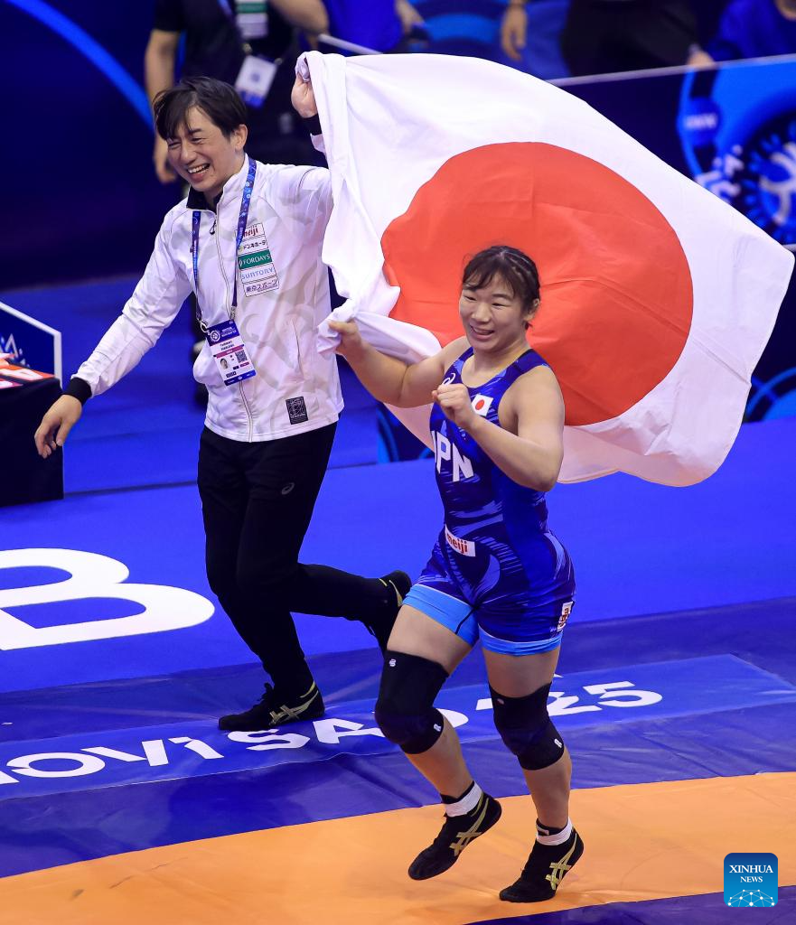 Japan's Motoki Sakura (L) celebrates victory against Ukraine's Iryna Bondar after their match for gold medal of the women's 62 kg category at the U23 Wrestling World Championships in Novi Sad, Serbia on Oct. 25, 2025. (Photo by Predrag Milosavljevic/Xinhua)
