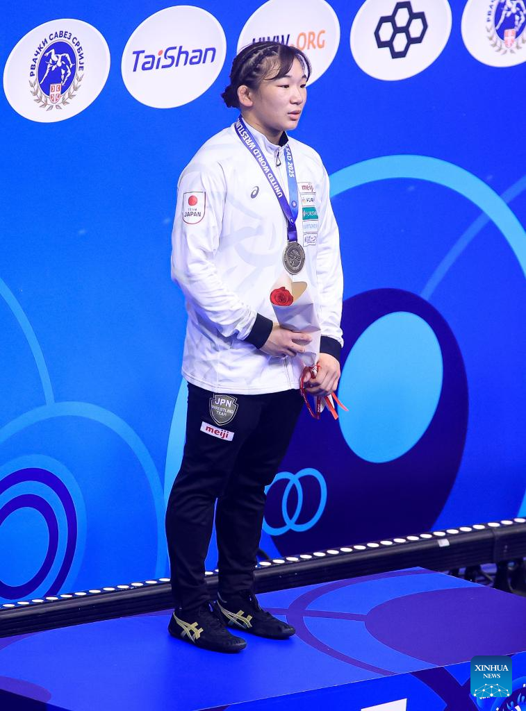 Gold medalist Japan's Motoki Sakura pose for the photo during medals ceremony of the women's 62 kg category at the U23 Wrestling World Championships in Novi Sad, Serbia on Oct. 25, 2025. (Photo by Predrag Milosavljevic/Xinhua)