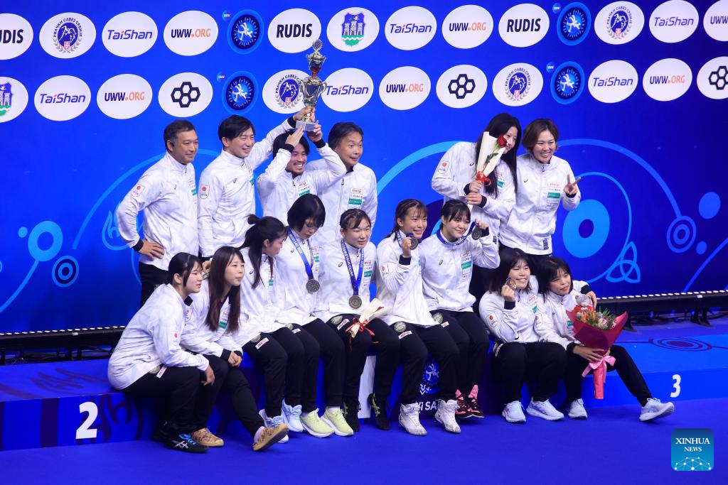 Japan's women's wrestling athletes and coaches pose for the team photo during medals ceremony at the U23 Wrestling World Championships in Novi Sad, Serbia on Oct. 25, 2025. (Photo by Predrag Milosavljevic/Xinhua)